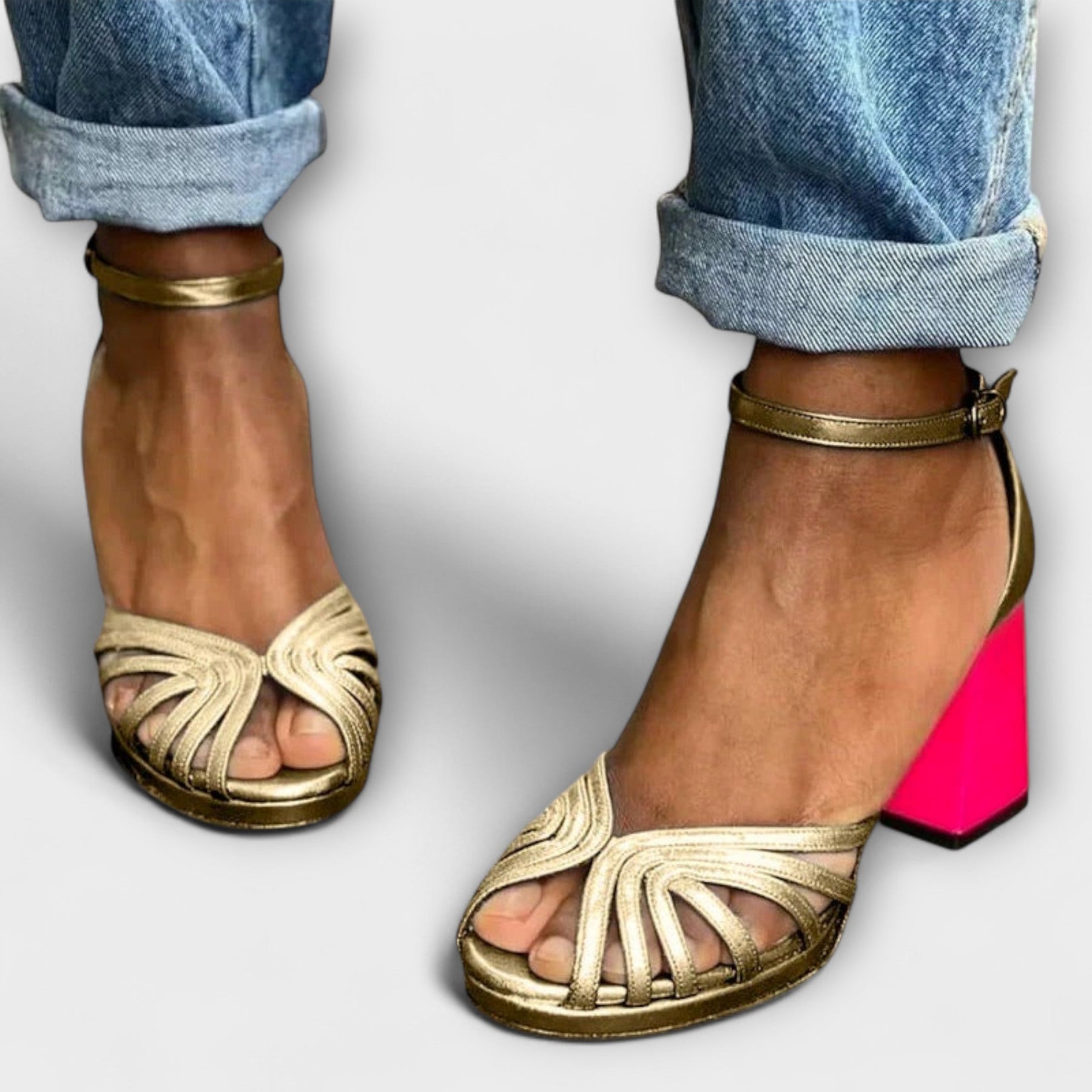 Mit mutigen Modefarben ziehen diese auffälligen, klobigen Absätze überall, wo Sie hingehen, alle Blicke auf sich. Die eleganten goldenen Riemen verstärken ihren Reiz und sorgen dafür, dass Sie in jeder Menge herausstechen.