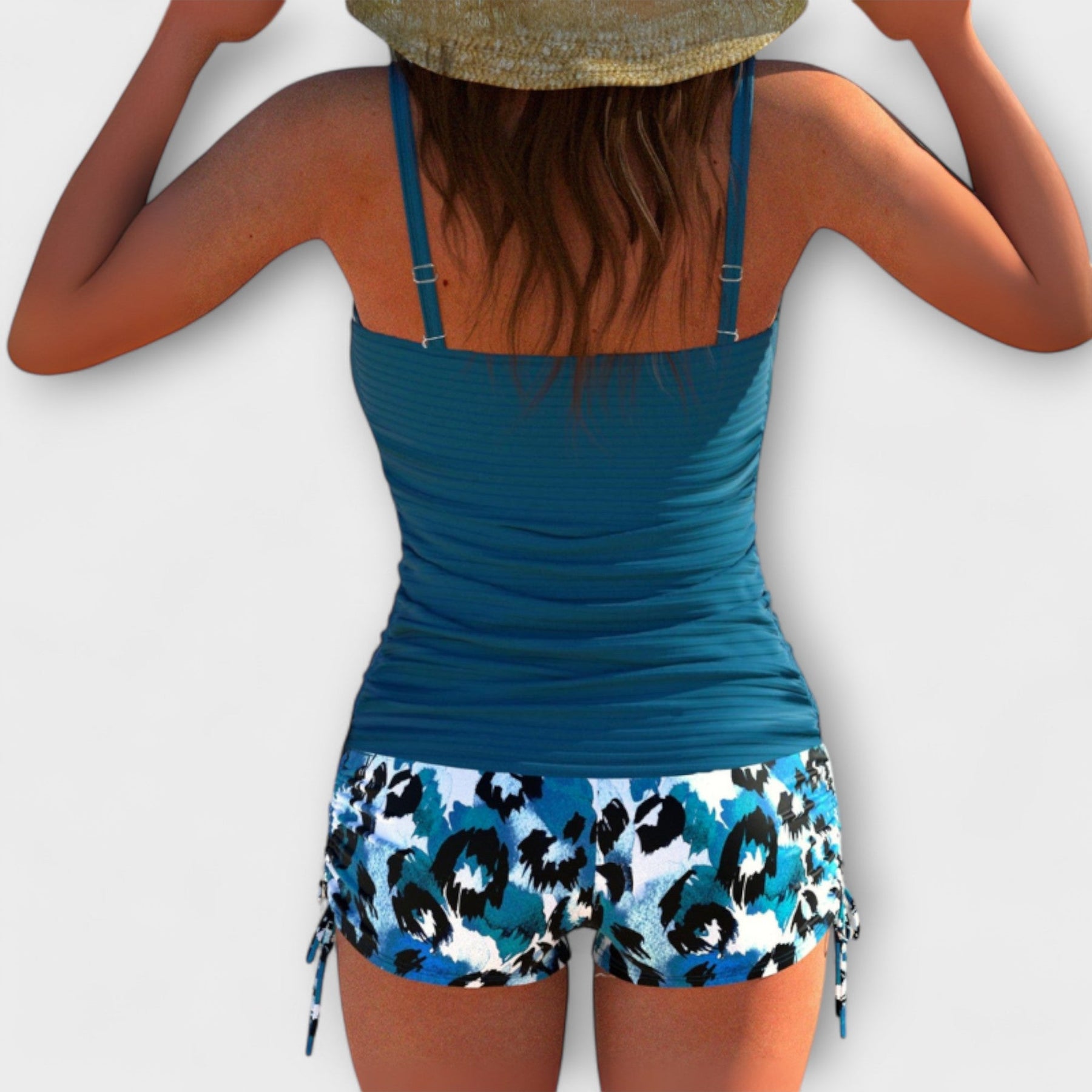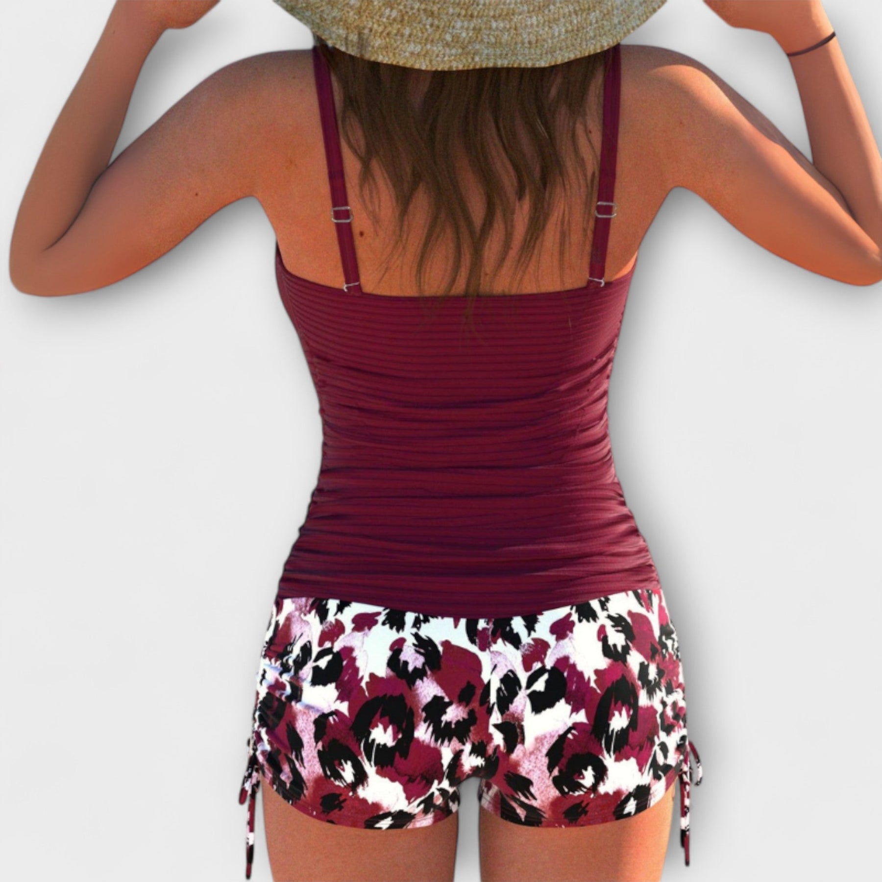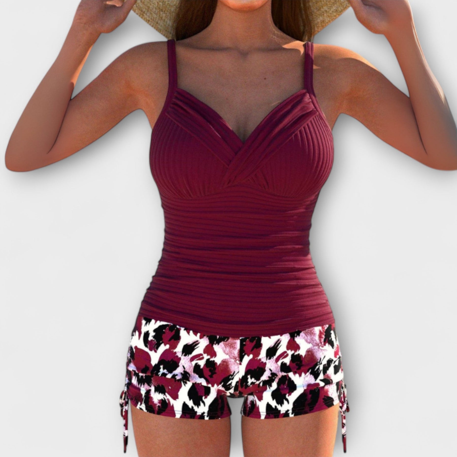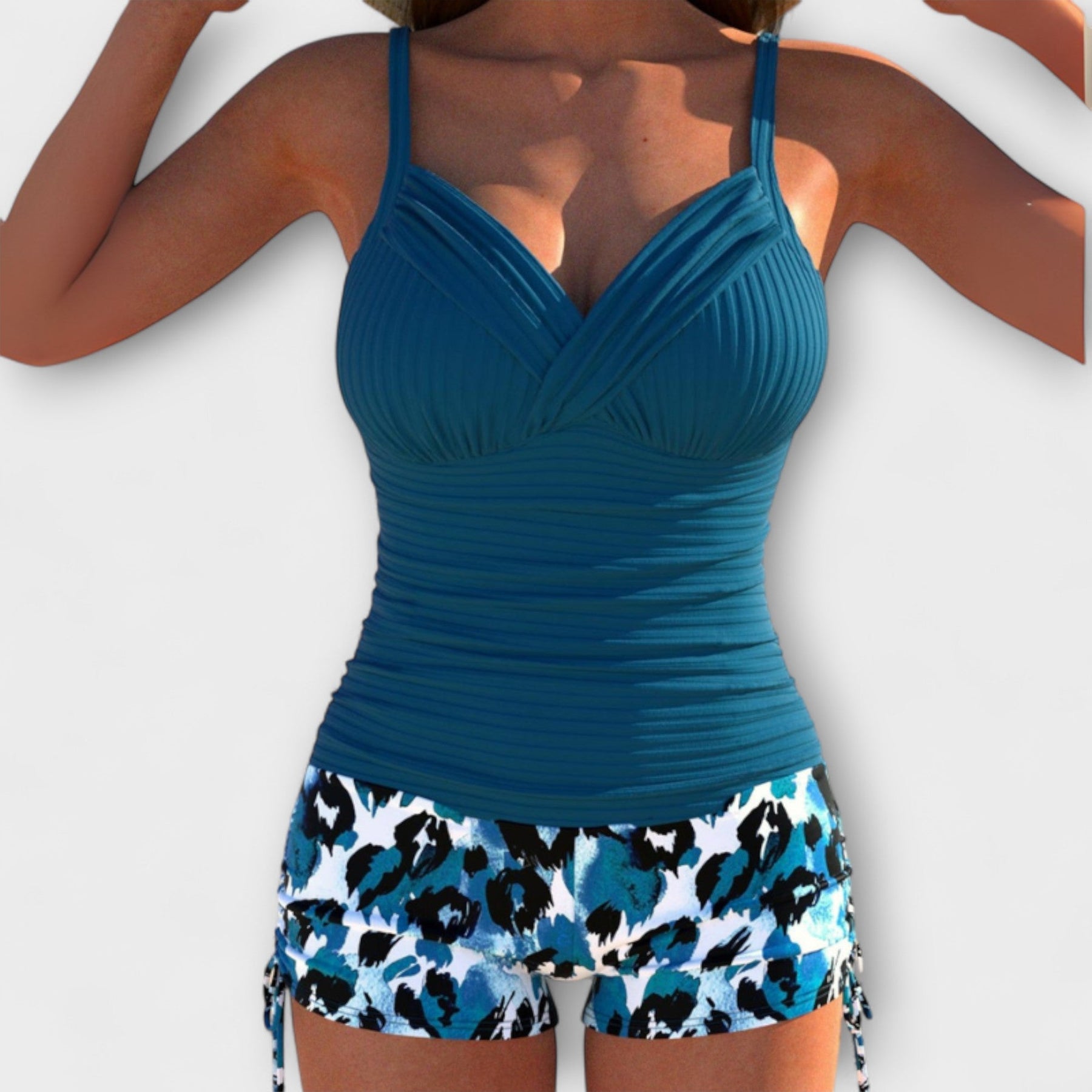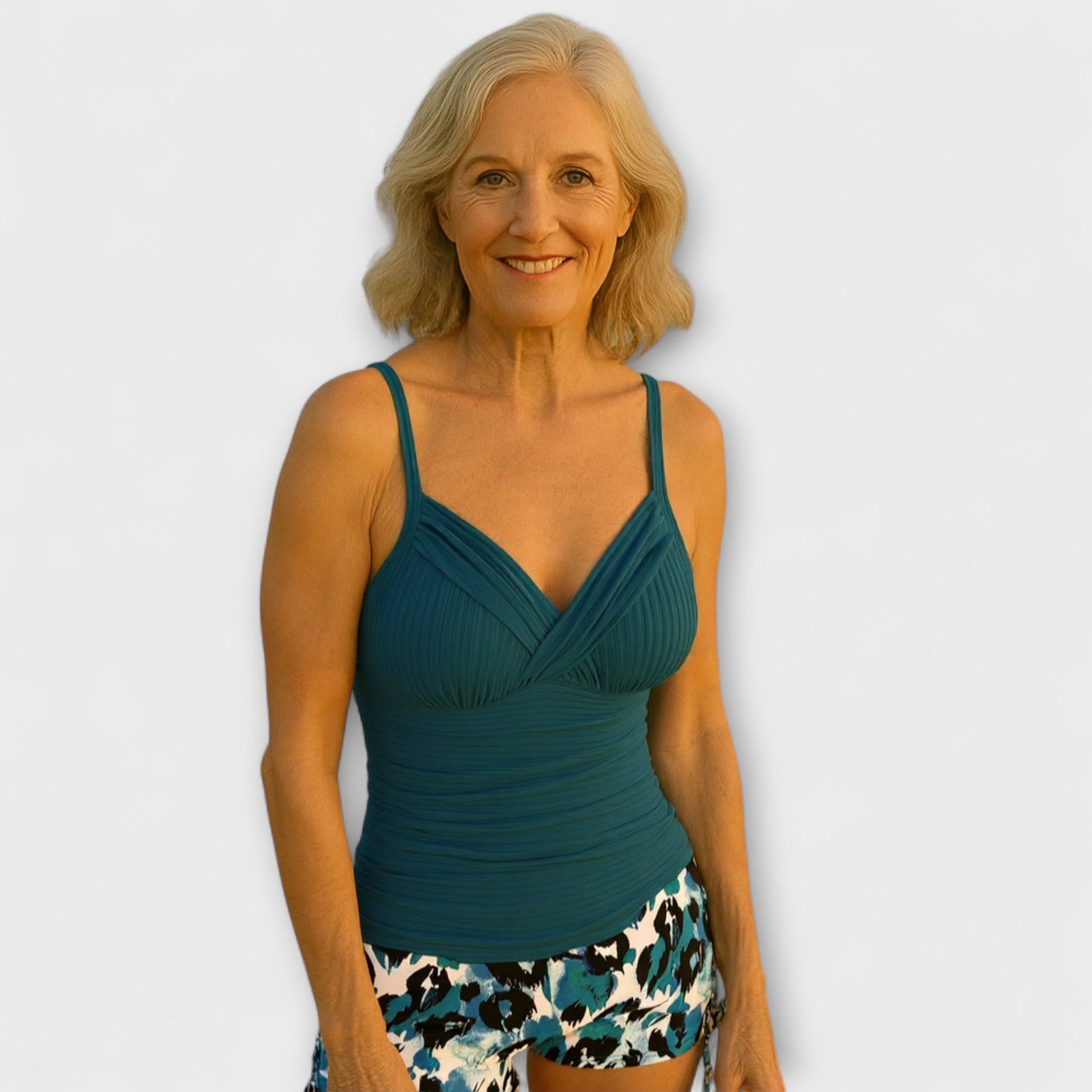 Entdecke unseren eleganten Tankini, der weiche Unterstützung bietet, ohne einzuengen. Mit einer schmeichelhaften hohen Taille, die subtil den Bauch kaschiert, fühlst du dich selbstbewusst und frei – perfekt für jeden Tag am Wasser.