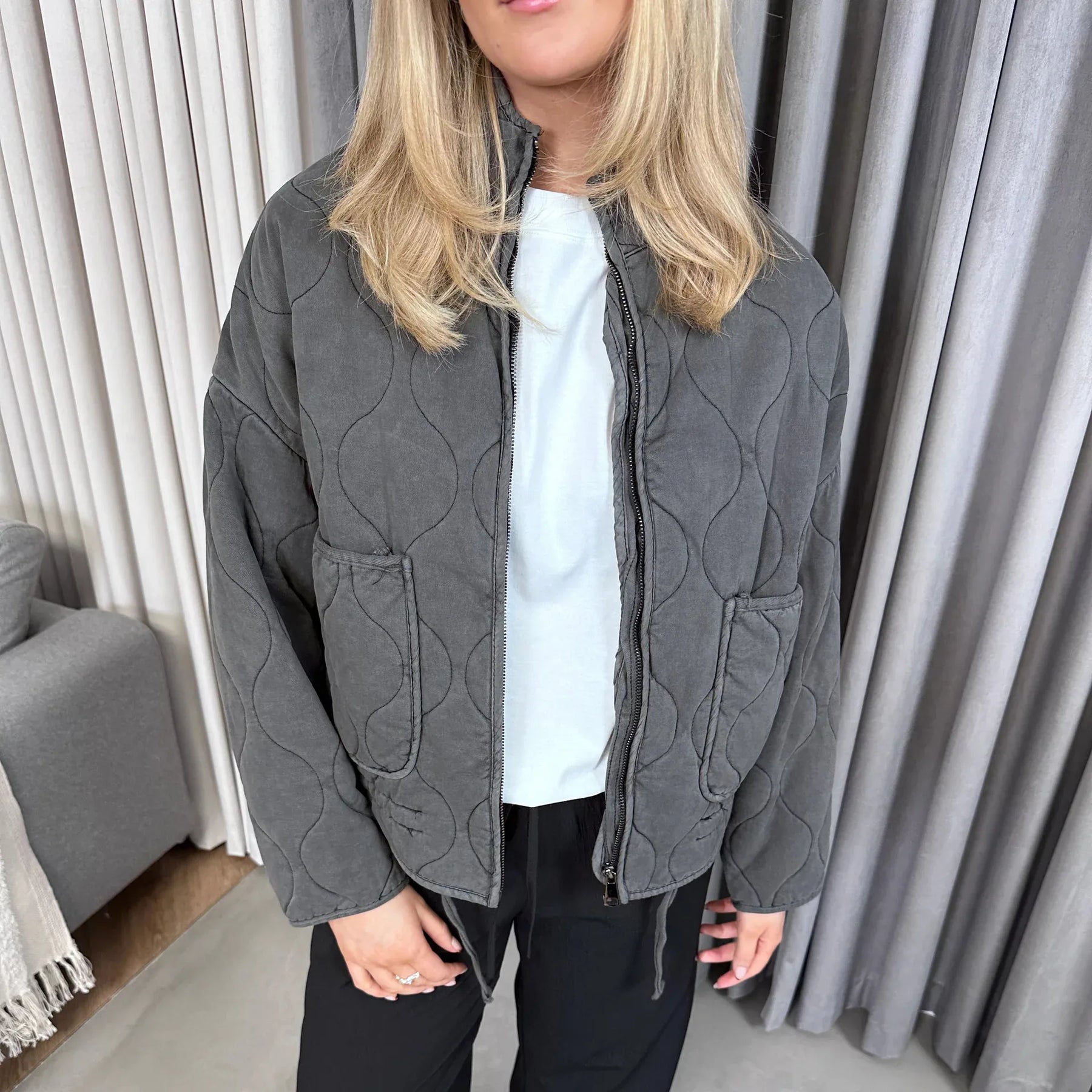 Bewältige kalte Tage mit Leichtigkeit in diesem leichten gepolsterten Layer, der alltägliche Funktionalität mit einem unverwechselbaren Stil kombiniert. Die oversized Silhouette bietet eine entspannte Eleganz, während die großen Taschen praktische Nützlichkeit mit modernem Charme vereinen. Hergestellt aus einem weichen und gemütlichen Stoff, hält sie dich warm, ohne zusätzliches Volumen hinzuzufügen. Ob du zu einem Brunch gehst oder shoppen gehst, diese Jacke vervollständigt deinen Look mit einem Hauch von natürlicher Eleganz.