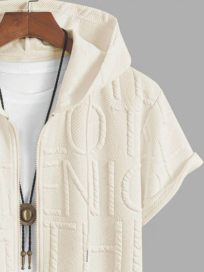Moderner strukturierter Schau: Die elegante Kurzarm-Kapuzenjacke Henryk verfügt über ein einzigartiges geprägtes Buchstabenmuster, das Ihrem Stil Tiefe und Charakter verleiht. Der Kurzarmschnitt sorgt für einen trendigen Schau und macht sie perfekt für Freizeitaktivitäten. Das Gestaltung verbindet mühelos Mode und Komfort und macht sie zu einer herausragenden Wahl für jede Garderobe.