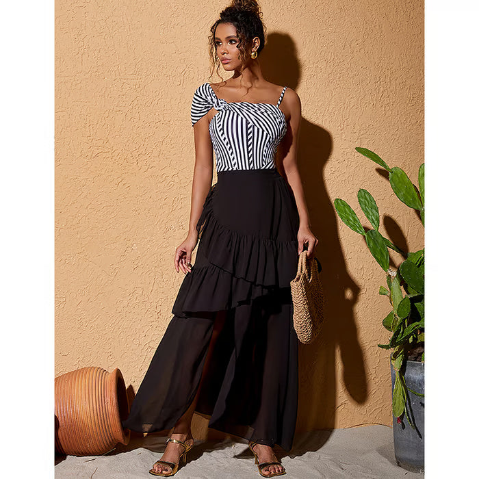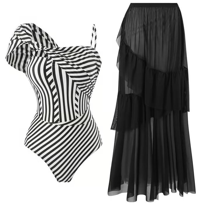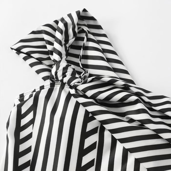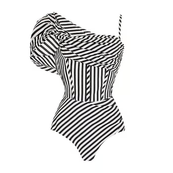Dieser einteilige Badeanzug mit asymmetrischem Design zeichnet sich durch seine Originalität und seinen modernen Stil aus. Ideal für alle, die ein einzigartiges Kleidungsstück suchen, das Eleganz und Trend vereint.