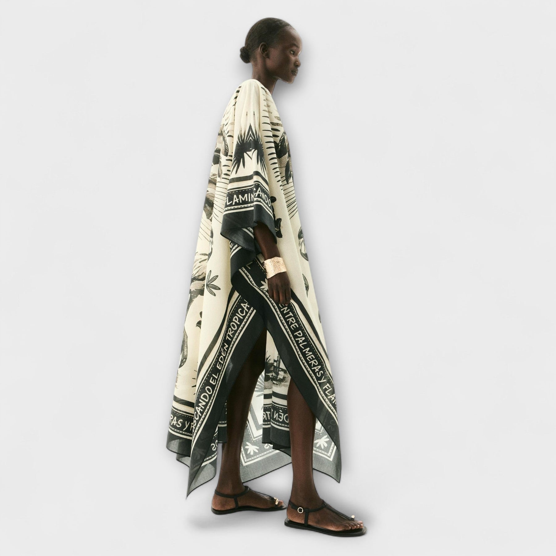 Mühelose Eleganz: Der auffällige Flamingo- und Palmendruck auf einem schicken hellbeigen und schwarzen Hintergrund sorgt dafür, dass Sie sowohl stilvoll als auch komfortabel aussehen.