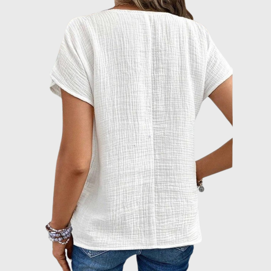 Unsere beliebte Riley Bluse wurde für warme Tage entworfen und ist ein echter Hingucker. Der leichte, atmungsaktive Stoff sorgt für maximalen Komfort, während der lässige Schnitt und die feinen Details deinem Look das gewisse Etwas verleihen. Ob für den Urlaub, ein Stadtbummel oder ein Treffen mit Freunden – diese Sommerbluse ist vielseitig und immer passend.