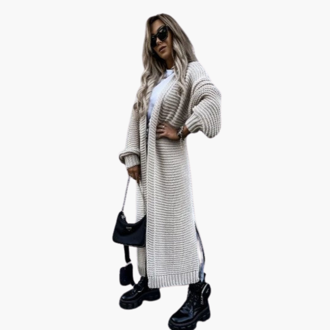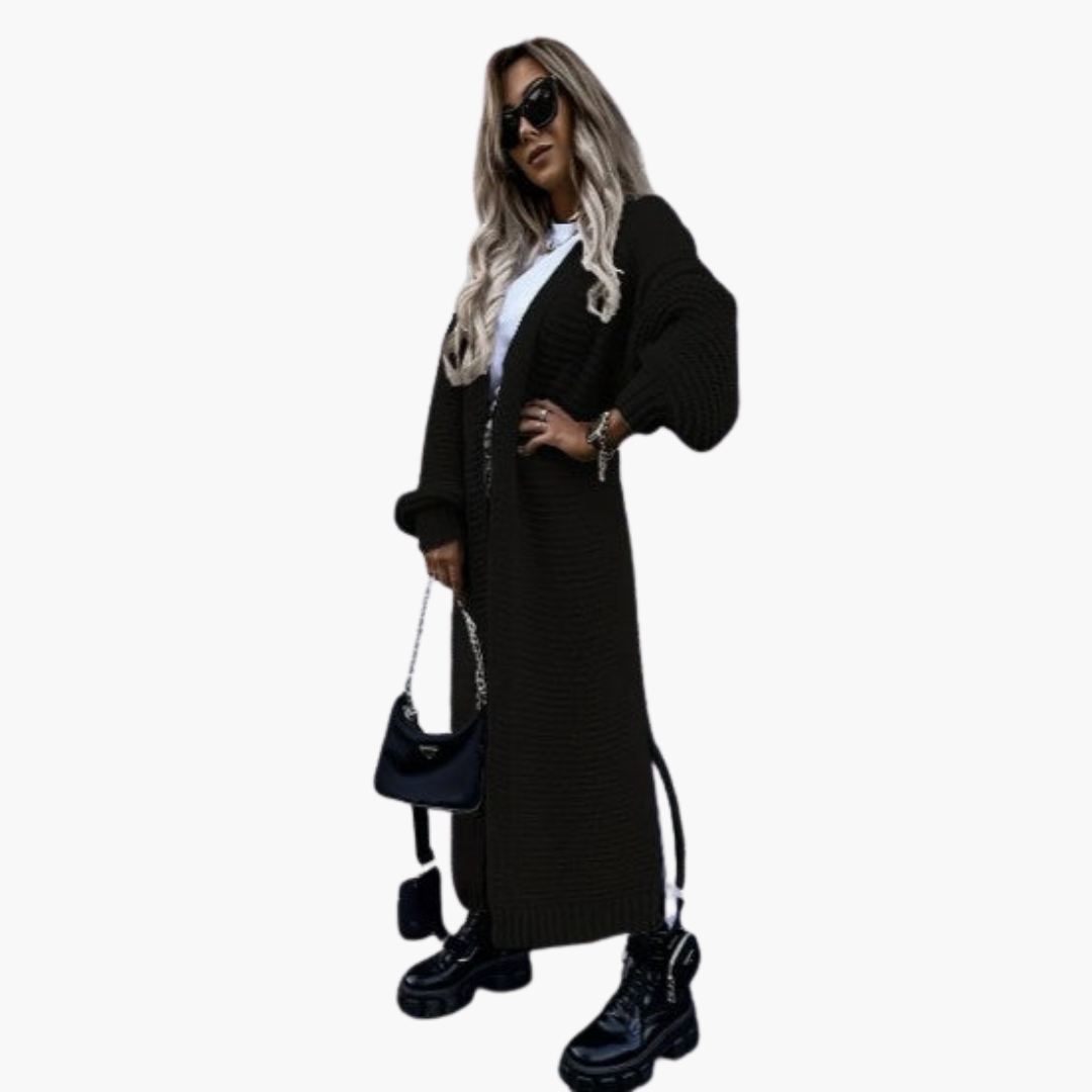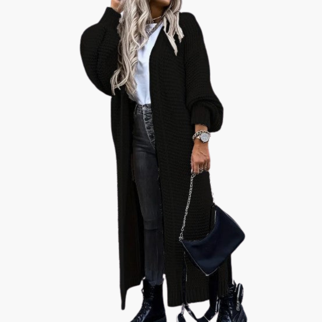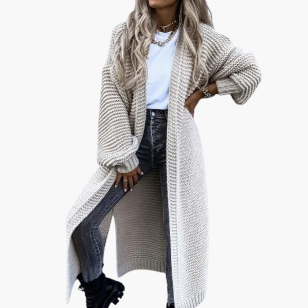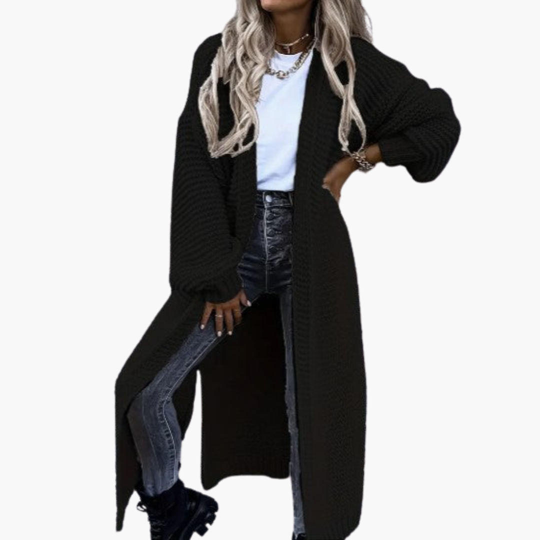 Diese lange Damenstrickjacke überzeugt mit einem offenen Schnitt, der vielseitige Kombinationen über verschiedenen Oberteilen ermöglicht. Die gerippten Ärmelabschlüsse setzen dezente Akzente, während der verlängerte Saum zusätzliche Bedeckung bietet. Mit ihrer strukturierten Strickoberfläche und den lockeren Ärmeln ist die Strickjacke passend für den Alltag, das Büro oder Ausflüge in der kühleren Jahreszeit.