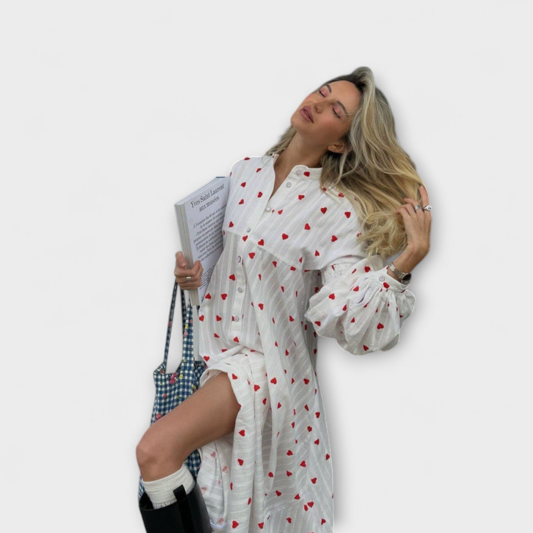 Wir präsentieren das Ophelia-Kleid – ein atemberaubendes Stück, das die Essenz entspannter Tage auf dem europäischen Land einfängt. Dieses bezaubernde Kleid aus 100 % strukturiertem Jacquard-Premiumpolyester ist mit einer leuchtend roten Herzgrafik verziert – ein klares Statement.
