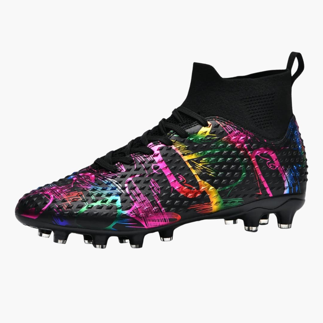 Diese Fußballschuhe für Herren verfügen über ein strukturiertes Synthetik-Obermaterial mit mehrfarbigen Oberflächenmustern und einen Schnürverschluss. Der Kragen ist knöchelhoch und gestrickt. Eine genoppte Gummilaufsohle sorgt für Traktion auf Rasen oder Kunstrasen. Heel- und Zungenschlaufen erleichtern das Anziehen. Die Oberfläche hat eine strukturierte Ausführung.