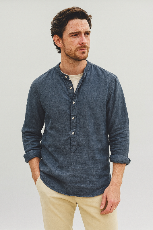Dieses Herrenhemd aus Leinen ist in einem geraden Schnitt mit klassischem Kragen gestaltet. Es verfügt über eine durchgehende Knopfleiste und lange Ärmel, ergänzt durch sauber verarbeitete Nähte.