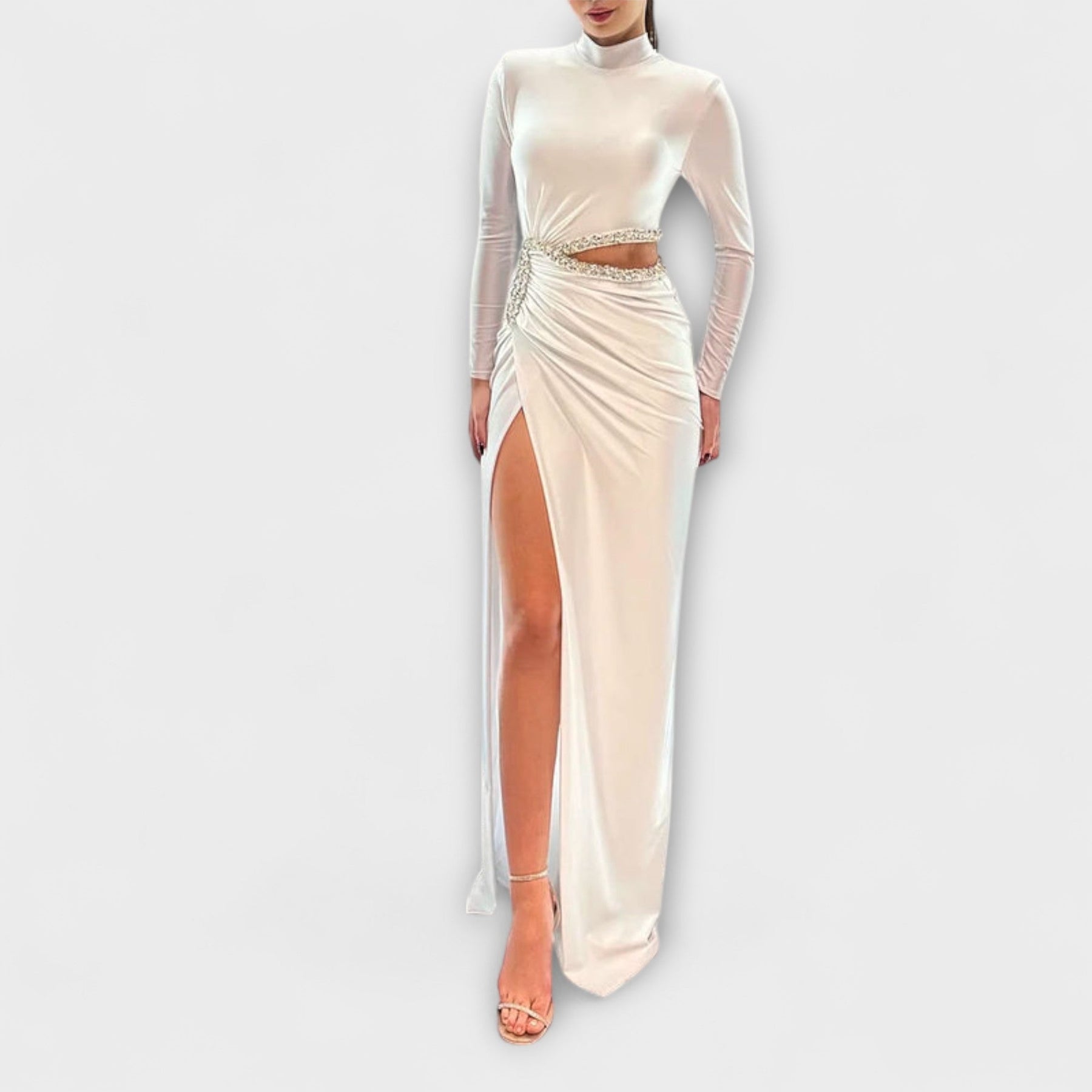 Selah - Weißes Langarmkleid mit Taillenausschnitt und Strassakzenten
